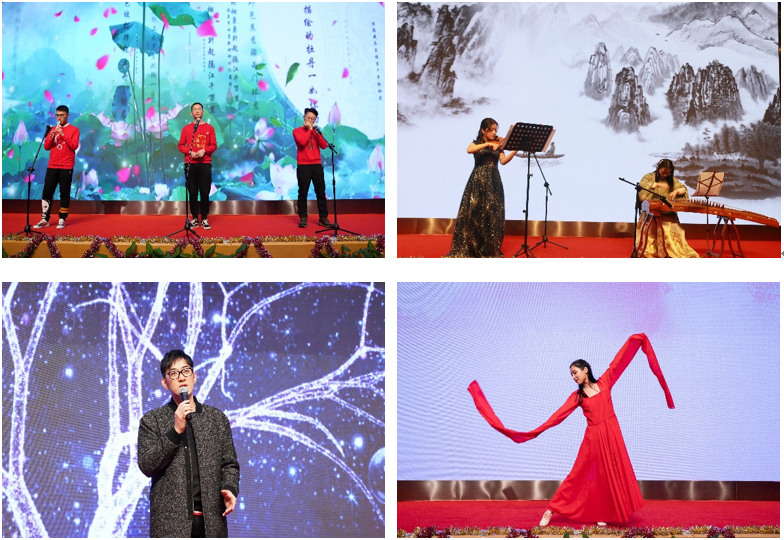 在悠扬婉转,国风悠然的《青花瓷》中,晚会第二乐章“孜孜不倦勤奋斗”清丽亮相。上海应用物理研究所的张磊等三位同学以陶笛,笛子和口琴合奏一曲,烟雨江边的等候,水墨渲染的情谊,仿佛置身于这天水一色中。每个人心中都有独一无二的一段回忆,上科大的吴锐同学《独家记忆》带着大家一同回望那份浪漫,体验那份穿越无数的美丽邂逅。落霞与孤鹜齐飞,秋水共长天一色,在高研院朱珂卉、周妙琴合奏的《渔舟唱晚》中体现得淋漓尽致。当古筝的隽永遇上小提琴的柔美,碰撞出了不一样的火花,夕阳西下,渔舟纷纷归航,江面歌声四起。复旦大学耿子端、创建两位同学带来一首钢琴弹唱《安静》,纯真而动听,将全场人一同带回插着耳机,追逐着周董的少年之时。古有诗云:“翩若惊鸿,宛若游龙。故有一舞,名曰:惊鸿”。高研院张斯颖一袭红妆,霓虹伴着舞姿,一曲惊鸿,舞动全场。在苍茫人海中,不要在前进的路上因为辛劳而丢失自己,迷失方向,高研院杜今、顾泽钰带来了一首经典合唱《不为谁而作的歌》,观众不自觉随声合唱,将晚会推向第二个高潮。