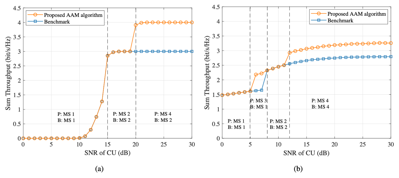 图2. 自适应调制算法的系统吞吐量性能对比:(a) 高斯白噪声信道;(b) 瑞利衰落信道。