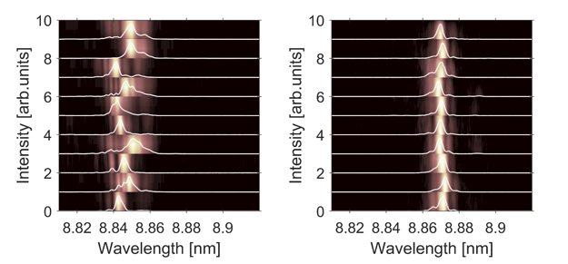 回声谐波级联自由电子激光具有优异的光谱性能:左图为常规级联模式,右图为回声谐波级联模式