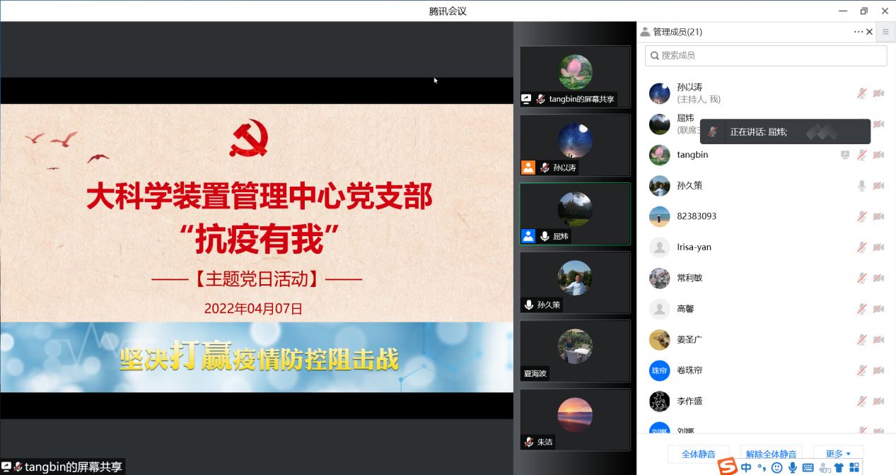本次上海抗击新冠疫情阻击战已经与病毒鏖战超过一个月,在严峻复杂的疫情防控形势下,高研院大科学装置管理中心团支部持续发挥战斗堡垒作用,结合实际情况,召开了抗疫专题线上组织生活会。高研院副院长、支部书记屈炜同志带领支部党员认清当下疫情防控形势,明确疫情防控要求,摸清当前师生职工需求,倡议下沉社区一线支援抗疫。